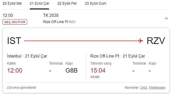 İstanbul’dan kalkan Türk Hava Yollarına ait TK2538 sefer sayılı uçak hava muhalefeti nedeniyle Rize’de inemeyince Rize-Artvin Havalimanı’nın üzerinde yaklaşık 6 tur attıktan sonra rotasını batıya çeviren uçak 425 kilometre uzaklıktaki Samsun Çarşamba Havalimanı’na indi.