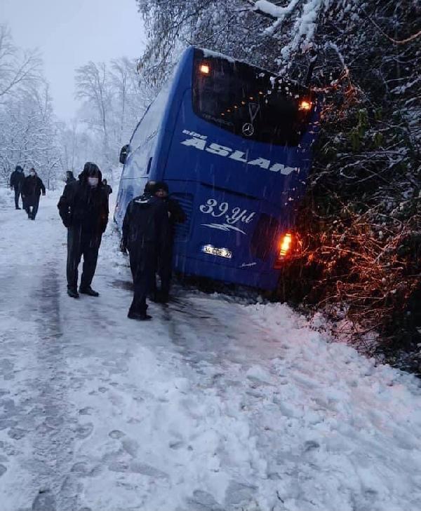 İstanbul’dan dün gece 25 yolcusuyla Kastamonu’nun Cide ilçesine gitmek için hareket eden yolcu otobüsü, bugün saat 05.30 sıralarında Bartın’ın Kurucaşile ilçesinde 300 rakımlı Hacı Mahmut Tepesi’ne geldiğinde zincirli olmasına karşın yoğun kar yağışı ve buzlanma nedeniyle kontrolden çıkıp, su kanalına girdi. Uzun uğraşlara rağmen şoför aracı hareket ettiremeyince, jandarmaya haber verildi.