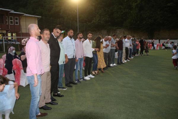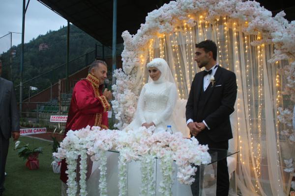 Türkiye’de, Covid-19 nedeniyle ertelenen düğün törenleri normalleşme süreciyle, alınan tedbirler kapsamında düzenlenmeye başlandı. İkizdere'de pandemi nedeniyle kapalı ortamda düğün yapmak istemeyen çiftler için futbol sahası hizmete sunuldu. Emine Aydın (27) ile Okan Havuz (34) çifti de düğünlerini yeşil sahada yaptı. Sosyal mesafe kuralına uyulan düğünde davetliler horonla eğlendi. Çiftin nikahlarını İkizdere Belediye Başkanı Hakan Karagöz kıydı.