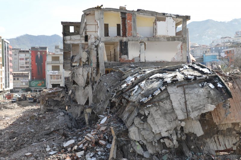 Çalışmaların ikinci gününde ekipler yıkımı tamamlanan ilk bloktan hafriyatı kamyonlarla taşırken, inşaatta bulunan demirler ayıklanıyor.