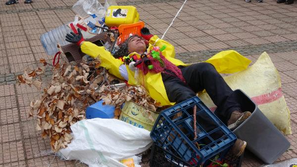 TRABZON'da çevre kirliliğine dikkat çekmek isteyen Binali Yıldırım Üniversitesi Güzel Sanatlar Fakültesi Dekanı Prof. Dr. Mehmet Kavukçu; kağıt, metal, naylon gibi atıkların bağlı olduğu 10 metrelik halatı çekerek, sahilde yürüdü. Bir süre yerde yatan ve 'sessiz çığlık' performansı ilgiyle izlenen Prof. Dr. Kavukçu, "Atık konusunda fazla duyarlılık yok. Pek çok şey düşünmeden rastgele harcanıyor, tüketiliyor. Bunlar da dünyayı yok etmeye başlıyor" dedi.