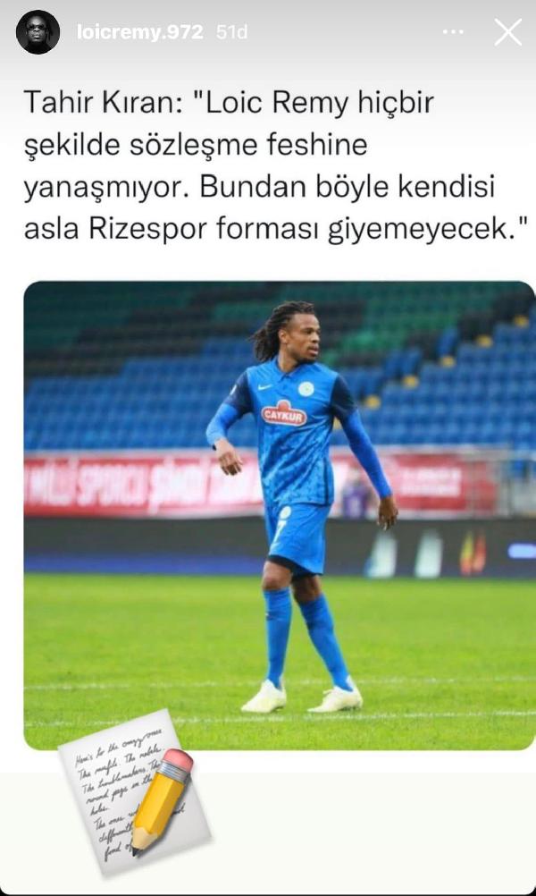 Çaykur Rizesporlu futbolcu Loic Remy, Kulüp Başkanı Tahir Kıran’ın kendisi ile ilgili yaptığı, “Loic Remy hiçbir şekilde sözleşme feshine yanaşmıyor. Bundan böyle asla Rizespor forması giymeyecek” açıklamayı sosyal medya hesabından sözleşmesini hatırlatarak, kalem ve kağıt ekleyerek paylaştı.