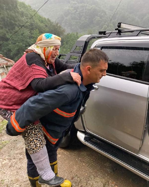 Ordu'da sağanak yağış hayatı olumsuz etkiledi. Çamaş ilçesine bağlı Budak Mahallesi'nde heyelan tehlikesi nedeniyle bir ev tahliye edildi. Evde yaşayan Cemal ve Fatma Duymaz, bölgeye sevk edilen itfaiye ekipleri tarafından evden çıkartıldı. Yürümekte zorluk çeken Fatma Duymaz'ı sırtına alan itfaiye eri, metrelerce kadını sırtında taşıyarak güvenli bölgeye ulaştırdı.