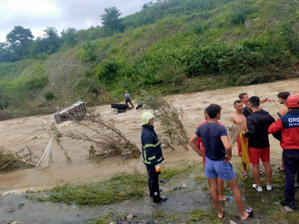 ORDU'nun Perşembe ilçesinde Adem Arslan, lastiklerini yıkamak için girdiği derede traktörle akıntıya kapılarak sürüklendi. derenin ortasında devrilen traktörün üzerinede mahsur kalan Arslan, ekipler tarafından halatla kurtarıldı.
