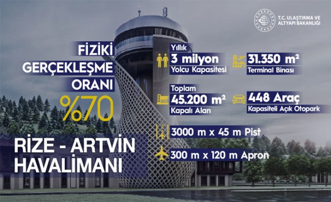 Karaismailoğlu, sosyal medya hesabından yaptığı açıklamada, "Rize-Artvin Havalimanı, dünyanın sayılı mühendislik örneklerinden birini Karadeniz'in üzerinde sergiliyor. 2,8 milyon metrekare deniz dolgusu üzerine inşa edilen, 3 milyon yolcu kapasiteli havalimanımızı yıl sonunda hizmete sunacağız. Çalışmalarını yüzde 70 oranında tamamladığımız Rize-Artvin Havalimanı, Karadeniz'in gelişen turizm ihtiyacını, güçlü altyapısı ile üst seviyeye taşıyacak. Güçlü altyapı, doğa ile uyumlu mühendislik." ifadelerini kullandı.
