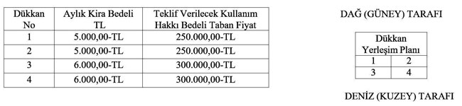 Mülkiyeti S.S. Rize Modern Küçük Sanayi Sitesi Yapı Kooperatifine ait olan 1734 ada 114 parseldeki 1, 2, 3 ve 4 numaralı bağımsız bölümlerin aylık kira bedelleri ve açık artırma usulü ile teklif verilecek kullanım hakkı taban fiyatları aşağıda belirtilmiştir.