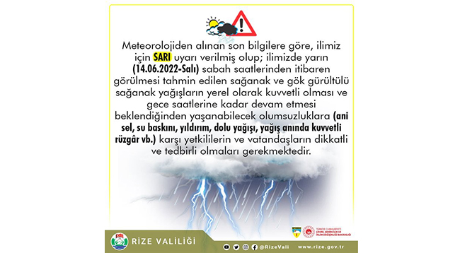 Sağanak yağışın beklendiği Rize'de Meteoroloji Genel Müdürlüğünden gelen uyarının ardından Rize Valiliğinin resmi sosyal medya hesabından yapılan açıklamada, "Meteorolojiden alınan son bilgilere göre, ilimiz için sarı uyarı verilmiş olup; ilimizde 14 Haziran 2022 Salı günü sabah saatlerinden itibaren görülmesi tahmin edilen sağanak ve gök gürültülü sağanak yağışların yerel olarak kuvvetli olması ve gece saatlerine kadar devam etmesi beklendiğinden yaşanılabilecek olumsuzluklara (ani sel, su baskını, yıldırım, dolu yağışı, yağış anında kuvvetli rüzgar vb.) karşı yetkililerin ve vatandaşların dikkatli ve tedbirli olmaları gerekmektedir" ifadelerine yer verildi.