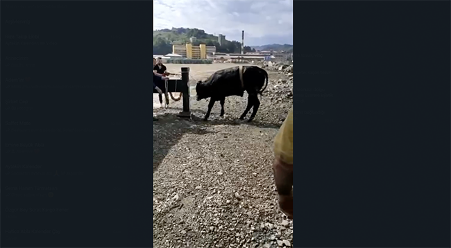 Bir süre sürüklenen kurbanlık, denize dolgu inşa edilen İyidere Lojistik Merkezi dolgu alanı önünde kayalıklarda sıkıştı. Kurban sahiplerinin tosunu çıkaramaması üzerine lojistik merkezinde çalışan şirket çalışanlarından vinç ardımı ile çıkarılması istendi.