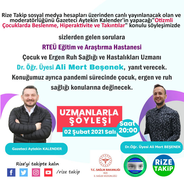 Rize Takip iş birliği ve Uzman Dr. Ali Mert Beşenek'in katılımı ile 2 Şubat'ta 'Otizmli Çocuklarda Beslenme, Hiperaktivite ve Takıntılar’ konulu çevrimiçi söyleşi düzenlenecek.