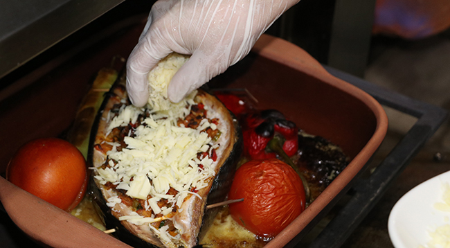 Palamut dolmanın lezzetli olabilmesi için yemeğin bütün içindeki ürünlerin organik seçildiğini ifade eden Çolak, "İçerisinde farklı bir sebzemiz yok. Domates, biber ve soğan var. Halis tereyağı kullanıyoruz. Ürünlerimizin organik olmasına dikkat ediyoruz. Yemek lezzet açısından ne kadar organik olursa iyi olur diye düşündük. Yemeğin çok uzun bir aşaması yok ama pişirme aşaması biraz uzun. Yaklaşık bir 30 dakika fırında kalması gerekiyor. Pişme aşamasına yakın kaşarını ilave ediyoruz" ifadelerini kullandı.