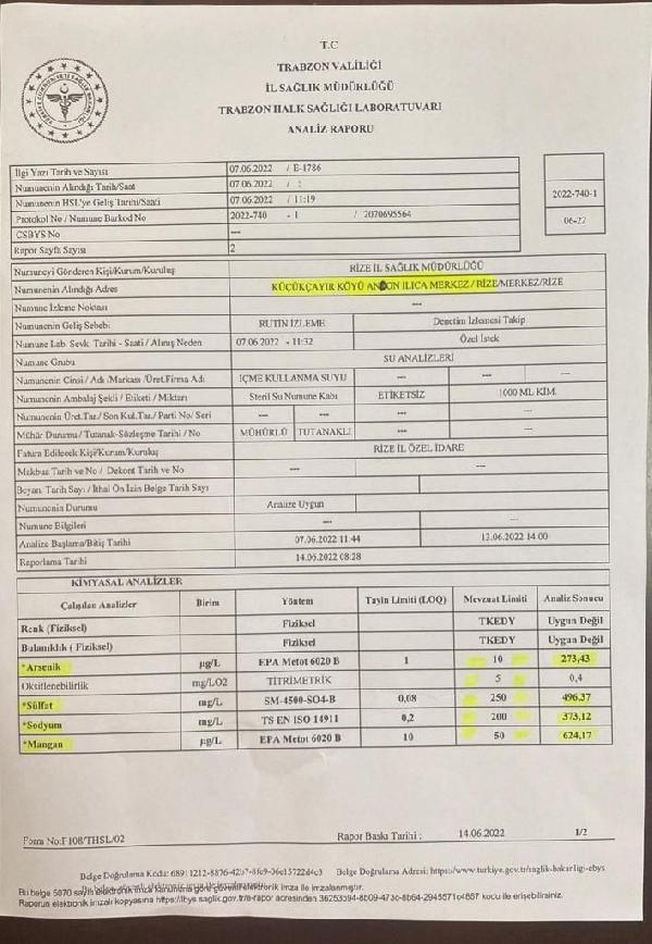Trabzon Halk Sağlığı laboratuvarlarına gönderilen numunelerin incelenmesi sonucunda suyun arsenik değerinin litresinde 10 mikrogram olması gerekirken, 27 kat fazlası 273,43 mikrogram olduğu ölçüldü. Analizlerde litrede 250 miligram olması gereken sülfat değeri de 496,37, 200 miligram olması gereken sodyum oranı ise 373,12 miligram ve 50 mikrogram olması gereken mangan oranı da 624,17 mikrogram çıktı. Suyun içmeye uygun olmadığının belirlenmesi üzerine İl Sağlık Müdürlüğü ekipleri çıkan analizler doğrultusunda içme suyunun bulunduğu yere ‘Bu suyun içilmesi sağlık açısından uygun değildir’ yazılı uyarı tabela astı.