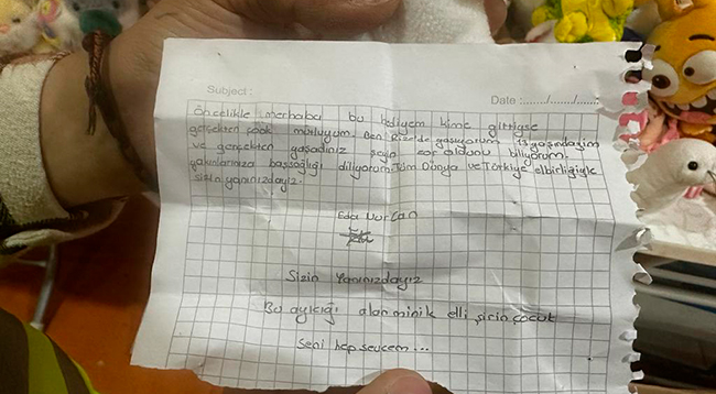 Minik Eda Nur tarafından yazılan notta “Ben Rize'de yaşıyorum 13 yaşındayım. Gerçekten yaşadığınız şeyin çok zor olduğunu biliyorum. Yakınlarınıza başsağlığı diliyorum. Tüm dünya ve Türkiye el birliğiyle sizin yanınızdayız. Bu ayıcığı alan minik elli şirin çocuk, seni hep sevicem” ifadeleri yer aldı.