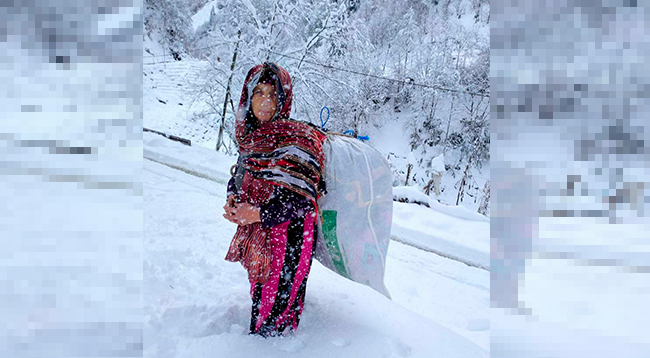 Teyzelerimiz, kıyafet, yiyecek gibi ihtiyaçları yükledikleri çuvalları sırtlarında taşıyarak kar kış demeden merkeze ulaştırıyor.