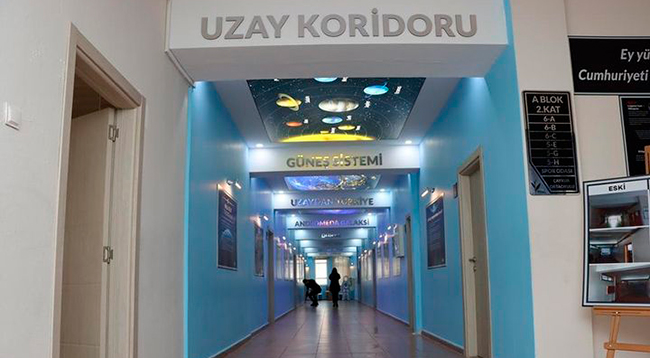 Koridor boyunca tavanda ve duvarlarda yer alan; Güneş sistemi, dünyamız, gezegenler, uzay araçları ve galaksiler gibi uzaya dair bilgi ve görsellerle öğrencilerin bilime olan ilgisinin arttırılması amaçlanıyor.