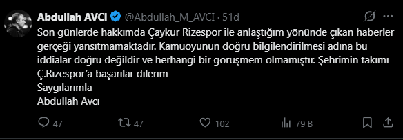 62 yaşındaki deneyimli teknik adam, resmi sosyal medya hesabından konuya ilişkin açıklamada bulundu. Avcı, hakkındaki haberlerin gerçeği yansıtmadığını belirterek, “Son günlerde hakkımda Çaykur Rizespor ile anlaştığım yönünde çıkan haberler doğru değildir. Herhangi bir görüşmem olmamıştır. Şehrimin takımı Çaykur Rizespor’a başarılar dilerim” ifadelerini kullandı.