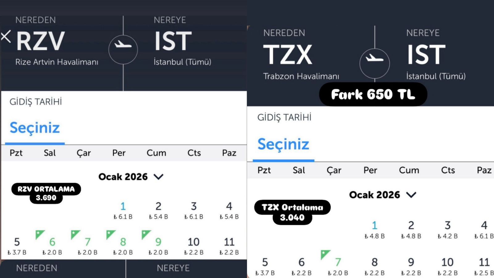 Yapılan incelemelerde, Rize-Artvin ve Trabzon havalimanları arasında İstanbul uçuşlarında belirgin bir fiyat farkı olduğu görülüyor. Önümüzdeki bir haftalık uçuş programı dikkate alındığında, Rize çıkışlı seferlerde bilet fiyatlarının Trabzon’a kıyasla ortalama 650 TL daha yüksek olduğu dikkat çekiyor.