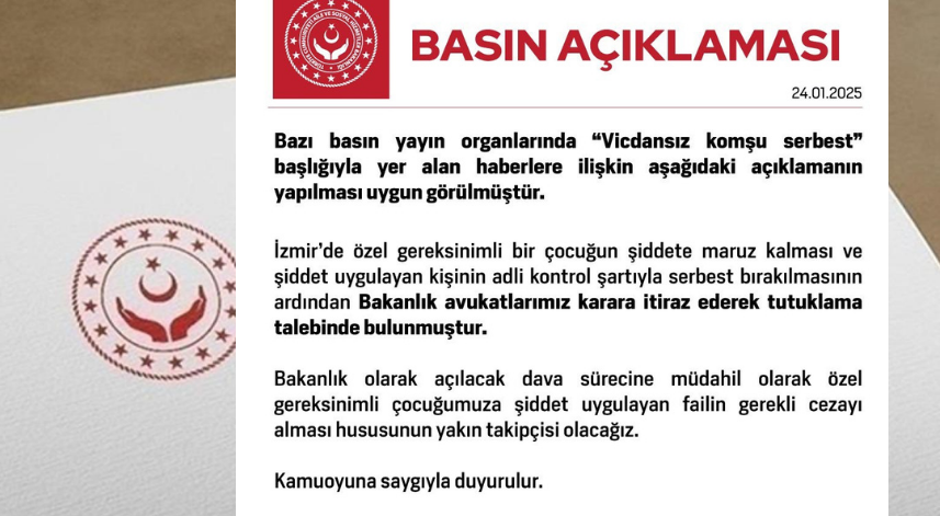 Bazı basın yayın organlarında “Vicdansız komşu serbest” başlığıyla yer alan haberlerin ardından Aile ve Sosyal Hizmetler Bakanlığı avukatları, adli kontrol şartıyla serbest bırakılan şahsın tutuklanması için talepte bulundu. Bakanlık tarafından yapılan yazılı açıklamada, “İzmir'de özel gereksinimli bir çocuğun şiddete maruz kalması ve şiddet uygulayan kişinin adli kontrol şartıyla serbest bırakılmasının ardından Bakanlık avukatlarımız karara itiraz ederek, tutuklama talebinde bulunmuştur. Bakanlık olarak açılacak dava sürecine müdahil olarak özel gereksinimli çocuğumuza şiddet uygulayan failin gerekli cezayı alması hususunun yakın takipçisi olacağız2 denildi.
