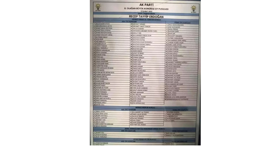 AK Parti 8. Olağan Büyük Kongresi'nde Merkez Karar ve Yönetim Kurulu (MKYK), Merkez Disiplin Kurulu, Siyasi Erdem ve Etik Kurulu ile Genel Merkez Parti İçi Demokrasi Hakem Kurulunun yeni üyeleri belirlendi.AK Parti'nin Ankara Spor Salonu'nda düzenlenen 8. Olağan Büyük Kongresi'nde yapılan tüzük değişikliğiyle MKYK'de 36 isim yerini korurken, 39 isim yeni parti yönetiminde yer almadı. Kurula 39 yeni isim girdi. Böylece MKYK'nin yüzde 52'si yenilenmiş oldu.AK Parti'nin 8. Olağan Büyük Kongresi'nde oluşturulan yeni listeye göre asil üyeler şu isimlerden oluştu:"Abdulkadir Develi, Abdurrahman Akyüz, Ahmet Baha Öğütken, Ahmet Bilal Kıymaz, Ahmet Büyükgümüş, Ahmet Mücahit Arınç, Ali İhsan Yavuz, Ayşe Keşir, Aziz Babuşcu, Belgin Uygur, Cengiz Tokmak, Cihad Terzioğlu, Çiğdem Karaaslan, Derya Ayaydın, Dursun Ataş, Efkan Ala, Erkan Güral, Erkan Kandemir, Eyyüp Kadir İnan, Fahrettin Yahşi, Fatih Sadullah Selman, Fatih Şahin, Fatma Betül Sayan Kaya, Fadime Zehra Şener, Gökhan Diktaş, Halit Yerebakan, Hamza Dağ, Hasan Basri Yalçın, Hayati Yazıcı, Haydar Ali Yıldız, Hilal Kalyoncu Koç, Hilmi Türkmen, Hülya Terzioğlu, Hüseyin Yayman, İdris Nebi Hatipoğlu, İsmet Gergerli, Kürşad Zorlu, Mahir Ünal, Mehmet Kırmızı, Mehmet Umut Tuncer, Melek Duman, Menderes Mehmet Tevfik Türel, Mesut Özil, Muhammed Faruk Acar, Mustafa Demir, Mustafa Elitaş, Mustafa Hulki Cevizoğlu, Mustafa Nedim Yamalı, Mustafa Özkan, Mustafa Şen, Naim Makas, Nihat Zeybekci, Nihal Ayan, Osman Gökçek, Ömer Çelik, Ömer Faruk Besli, Ömer İleri, Ömer Serdar, Önder Matlı, Sadettin Hülagü, Selçuk Sümer, Serap Yazıcı Özbudun, Serpil Kavrak, Sevan Sıvacıoğlu, Sevilay Tuncer, Seyithan İzsiz, Temel Başalan, Türk İslam Karakoç, Umut Arman Sonay, Ünal Karaman, Veli Arslan, Yusuf Ziya Yılmaz, Zafer Sırakaya, Zakir Avşar ve Ziya Serdar Kılıç."