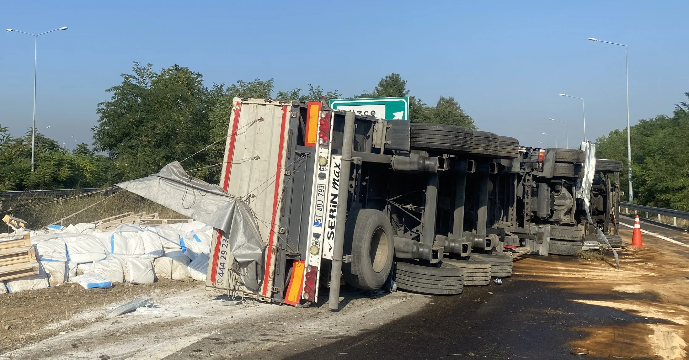 Otoyolun İstanbul istikametinde seyreden M.C. idaresindeki 51 ADJ 120 plakalı çimento yüklü tır, Beyköy mevkisinde sürücünün direksiyon hakimiyetini kaybetmesi sonucu devrildi.