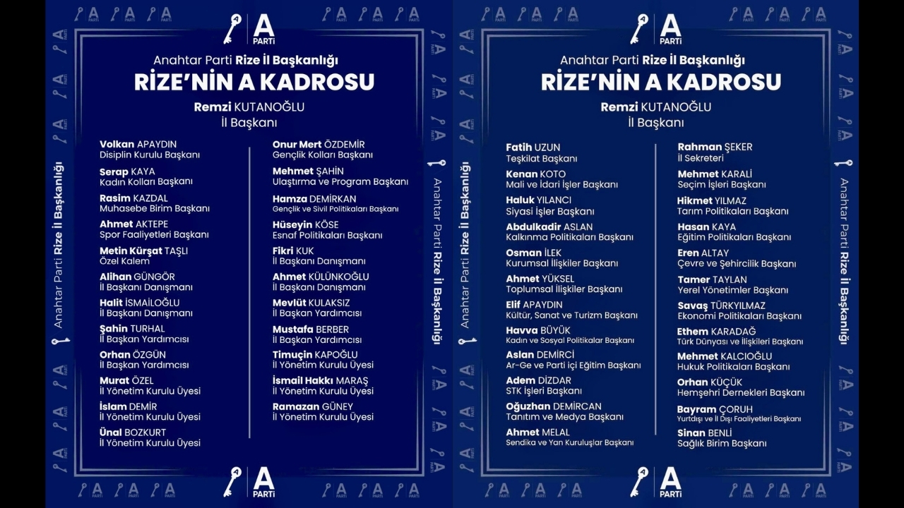 Anahtar Parti Rize İl Başkanlığı, il yönetim kadrosu ve politika başkanlıklarındaki görevlendirmeleri duyurdu.