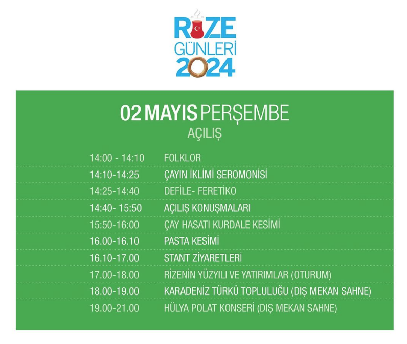 Rize Valiliği ve Belediye Başkanlığı’nın himayelerinde; Ankara Rize Dernekler Federasyonu (RİDEF) tarafından 2-5 Mayıs tarihleri arasında Ankara Millet Bahçesi’nde Rize Günleri etkinliği düzenlenecek.