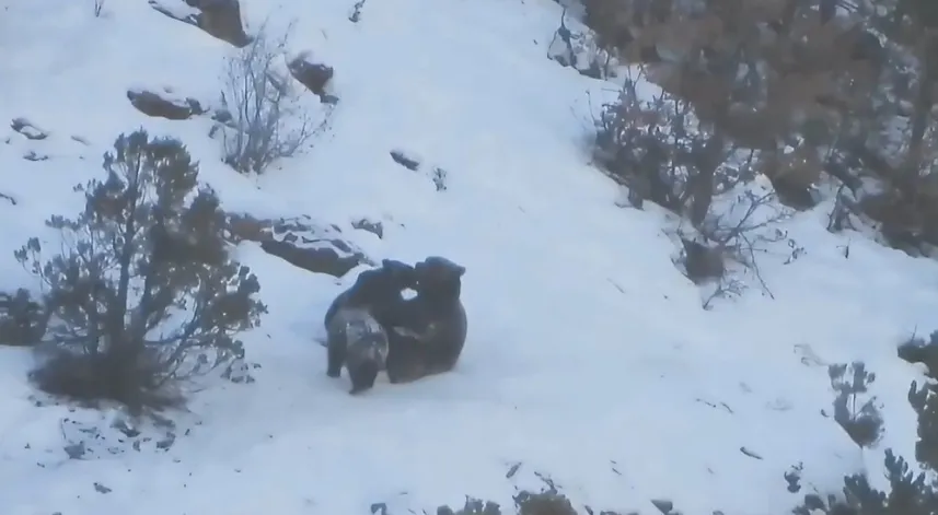 Anne ayı ve iki yavrusunun karla kaplı ormanda oyunları fotokapana takıldı. DKMP, o anları sosyal medya hesabından, "Karla kaplı ormanda anne ve yavru ayılar neşeyle yuvarlanıp oynuyor; bize de neşelerine ortak olmak düşüyor" ifadeleri ile paylaştı.