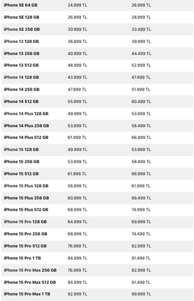 Apple, fiyat artışının nedenini ise açıklanmadı. Zam sonrasında en ucuz iPhone 15 modeli 53.999 TL oldu. Benzer şekilde en ucuz iPhone 15 Plus; 61.999 TL, iPhone 15 Pro; 69.999 TL ve iPhone 15 Pro Max; 82.999 TL oldu.