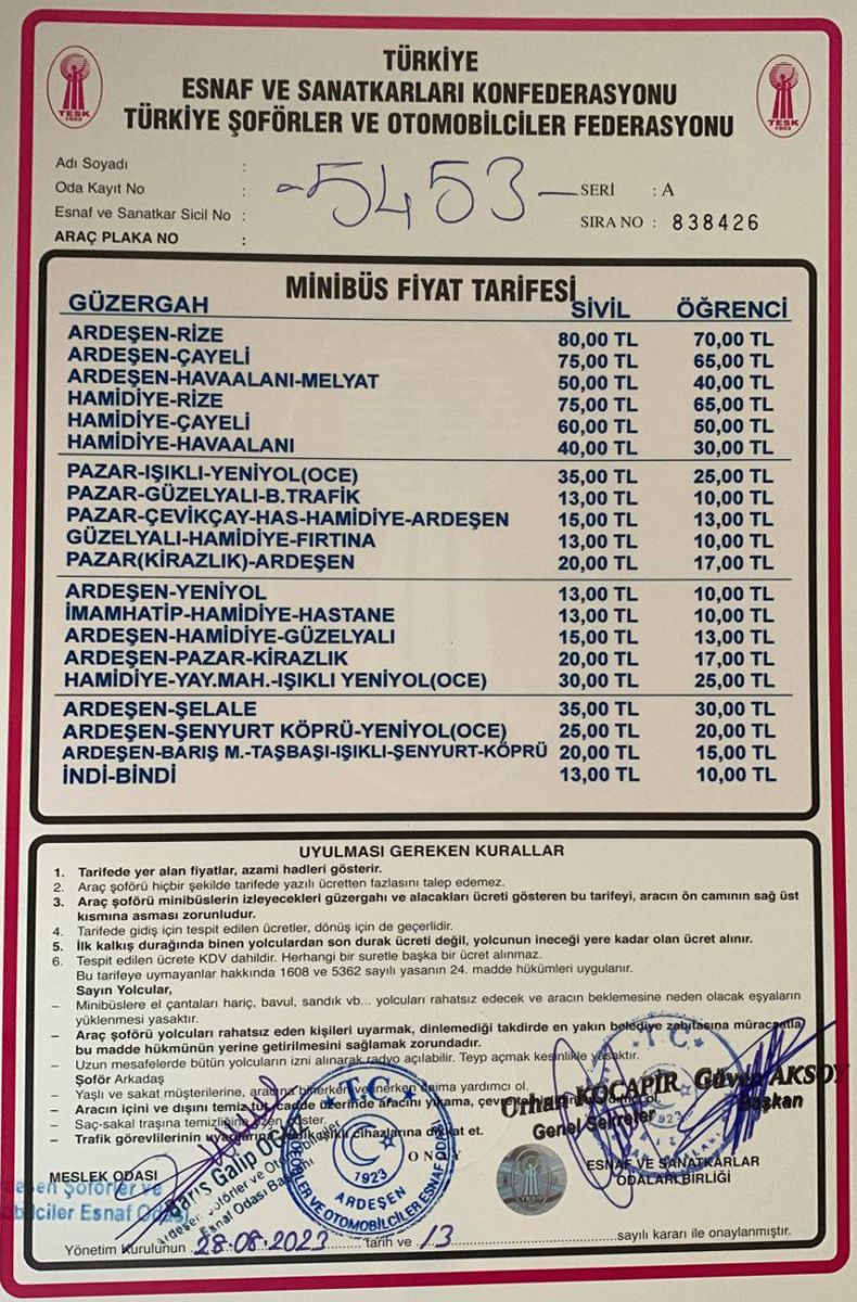 Ardeşen ilçesinde dolmuş ücretlerine zam yapıldı.