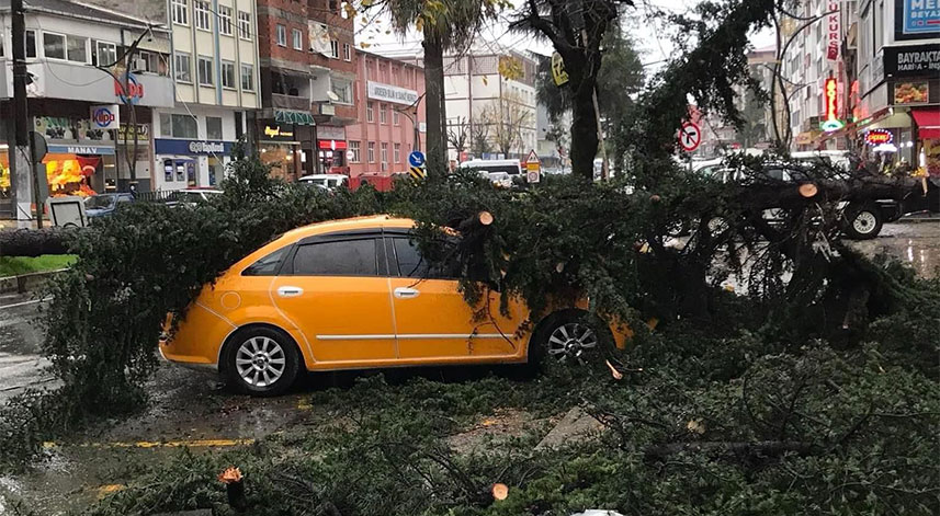 Araçlarda maddi hasar meydana gelirken, yola ve taksiler üzerine düşen ağaçlar, ekipler tarafından kaldırıldı.