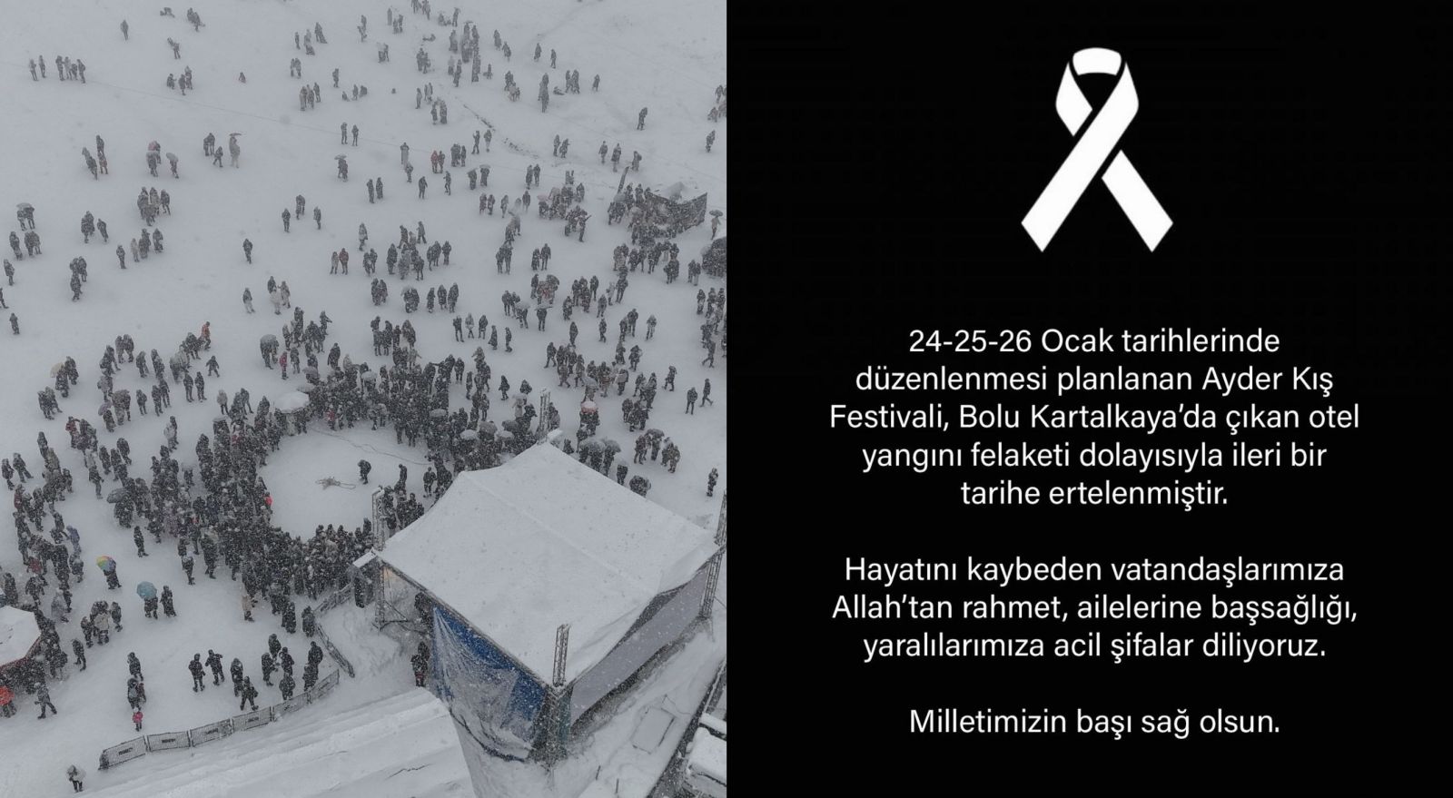 Çamlıhemşin Kaymakamlığı'ndan yapılan açıklamada, "24-25-26 Ocak tarihlerinde düzenlenmesi planlanan Ayder Kış Festivali, Bolu Kartalkaya'da çıkan otel yangını felaketi dolayısıyla ileri bir tarihe ertelenmiştir. Hayatını kaybeden vatandaşlarımıza Allah'tan rahmet, ailelerine başsağlığı, yaralılarımıza acil şifalar diliyoruz." ifadeleri kullanıldı.