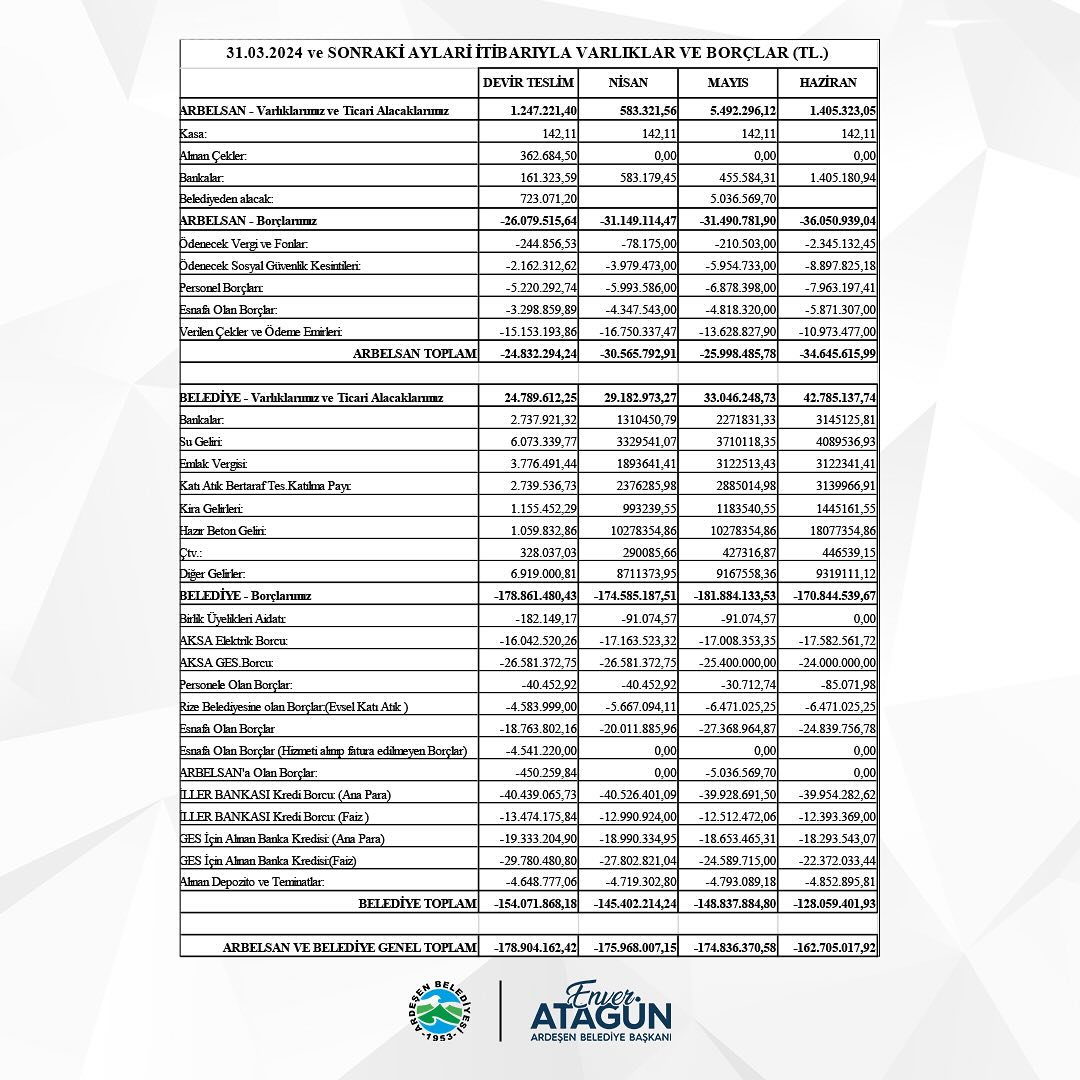 Ardeşen Belediye Başkanı Enver Atagün, belediyenin ilk 100 günlük mali raporunu yayınladı.