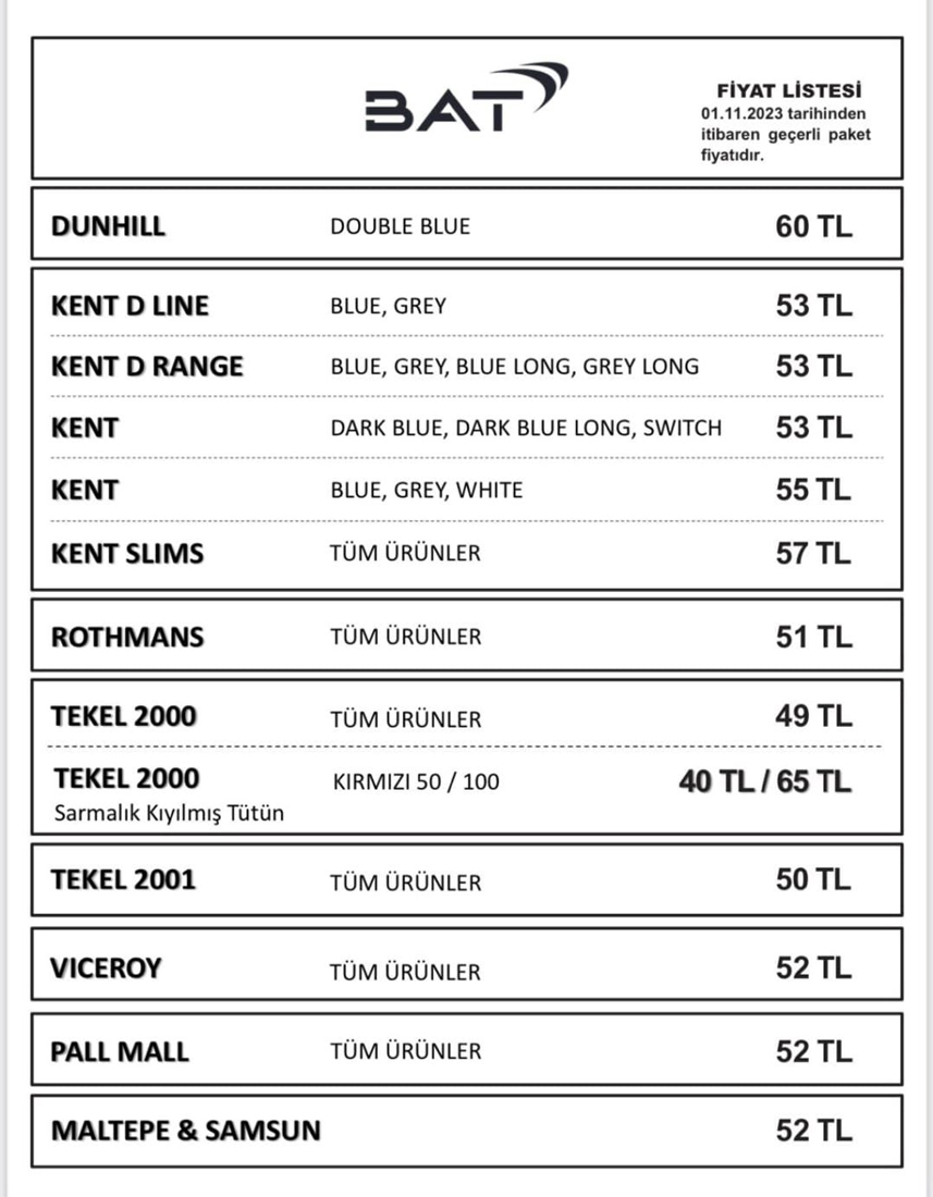 Son zamla birlikte BAT grubunun sattığı en ucuz sigara 48 TL oldu. Grubun en pahalı sigarası ise 60 TL'ye çıktı.