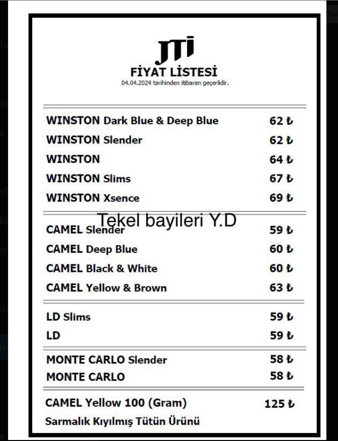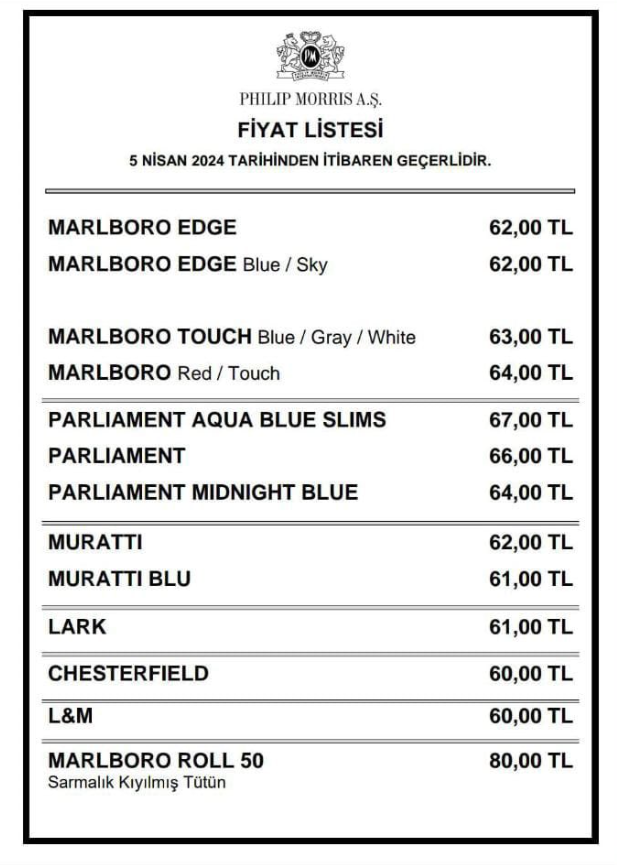 5 Nisan 2024 itibarıyla JTİ, grubunun en pahalı sigarası 69 TL, en ucuzu ise 58 liraya yükselirken; Philip Morris grubunda ise gelen 5 TL'lik zamdan sonra en pahalı sigara 67, en ucuzu ise 60 TL oldu.