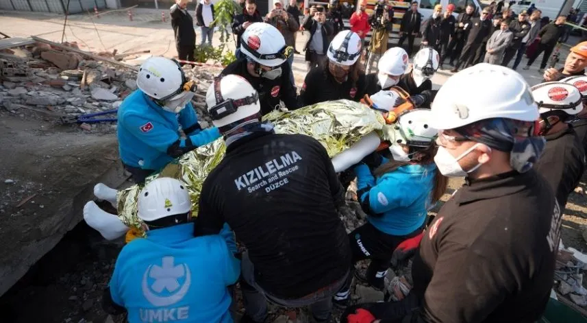 Belirlenen enkaz alanlarına giden ekipler, yıkıntıların altında kalan yaralıları simgeleyen maketleri çıkarıp sağlık ekiplerine teslim etti.