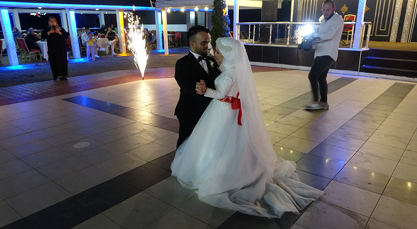Renkli görüntülerin yaşandığı düğünde piste el ele havai fişek ve konfetiler eşliğinde gelen çift davetlilerce alkış yağmuruna tutulurken, nikah töreninin ardından pistte uzun süre birlikte oynadı. Çifte yakınları ve davetliler de eşlik ederken, damat Enes Hacısalihoğlu heyecanlı ve mutlu olduğunu belirterek “Heyecanlıyım, mutluyum. İkimizde belediyede çalışıyorum orada tanıştık. Tanışmamız biraz uzun sürdü. Karar verdik ve nişanlandık. Sonunda buraya geldik. Allah’a şükürler olsun. Köyde güzel bir evlilik teklifi yapmıştım” dedi.