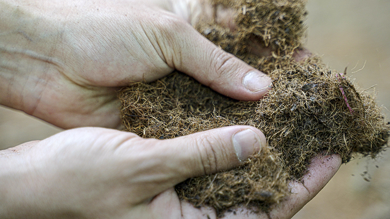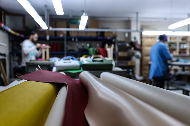 "Karadeniz Bölgesi'nde imalatı, ürün geliştirmesi olan çayımızın toplandıktan sonra kesilme ve kurutma aşaması oluyor. Kurutma aşamasından sonra ortaya çıkan atıklar var. O atıklardan aynı zamanda hayvan yemi de yapılıyor. Bu atıkların bir kısmı o sektöre veriliyor. Atıkların atığını da biz alıyoruz. Aslında gerçek atık bu ve bu atığı daha da öğüterek biz kendi bileşimimizi hazırlıyoruz. Bu bileşimin içerisinde kimyasal olmayan doğal ürünler var. O doğal ürünlerle beraber geri dönüşümlü kumaş üzerine, örneğin organik pamuktan üretilmiş ham bez üzerine, suni deri yapımı aşamasında yapıldığı gibi bir katman oluşturuyor ve bu katmanları makineler aracılığıyla kumaşın üstüne yayarak, kurutarak, renk vererek ve biyolojik polietilenle beraber bunu bitmiş deri ürün haline getiriyoruz."