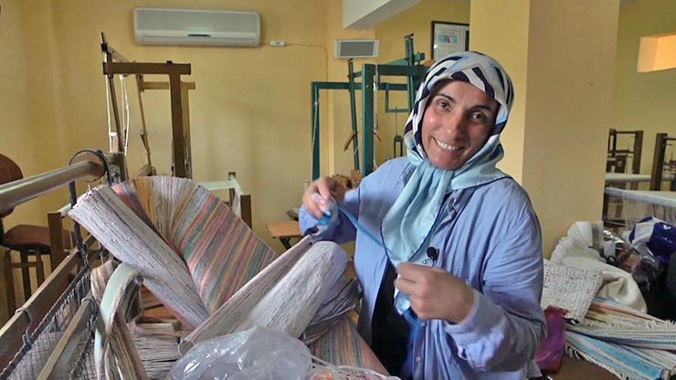 Halk Eğitim Merkezinde görevli usta öğretici Bilge Nur Güngör ve kursiyerleri, kumaş parçaları, çay çöpü gibi atıkları ip haline getirip dokuyarak çeşitli ürünler yapıyorlar.
