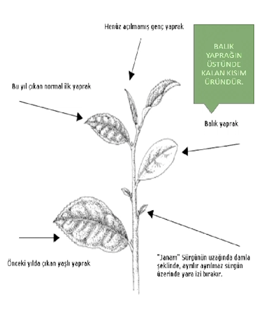 Çay tarımında balık yaprağı doğurucu yaprak olarak bilinir. Balık yaprağının sap kısmı ile birleştiği noktadan yani balık yaprağının koltuk kısmından bir sonraki meydana gelir.