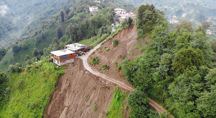 Rize’nin Çayeli ilçesinde 11 evin boşaltılmasına neden olan heyelan havadan görüntülendi.