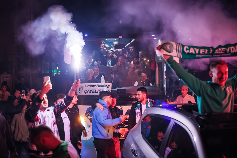 Şampiyonluk hedefinden asla vazgeçmeyen Çayelispor taraftarı, şimdiden şampiyonluk kutlamalarına başladı. Yeşil-beyazlı taraftarlar, takımlarına son iki maçta da destek vererek 3. Lige yükselmeyi hayal ediyor.