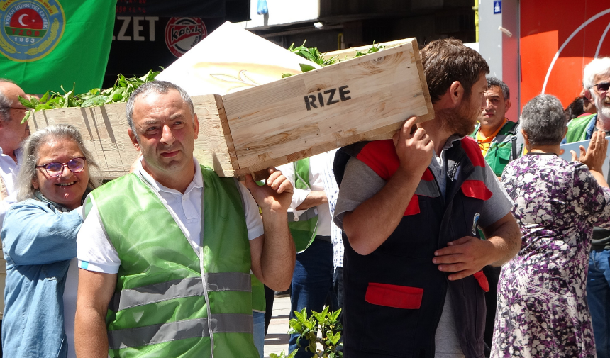 Rize’de çay taban fiyatlarının açıklanmasının ardından çay üreticileri, tabuta doldurdukları yaş çayı sokak sokak omuzlarında taşıyarak eylem yaptı.