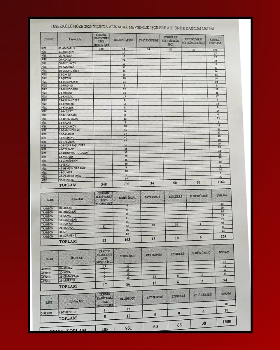 Söz konusu işçilerin 1162'si Rize, 94'ü Artvin, 224'ü Trabzon ve 20'si Giresun'daki fabrikalarda çalıştırılmak üzere istihdam edilecek.