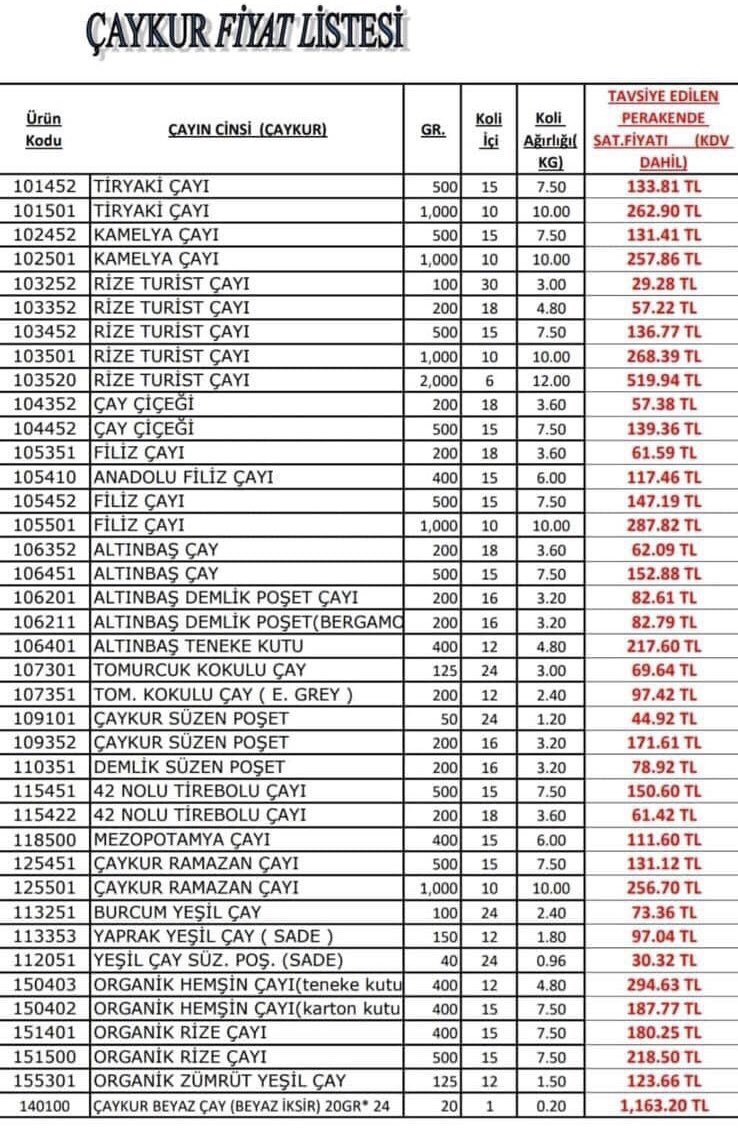 ÇAYKUR KURU ÇAY FİYAT LİSTESİ
