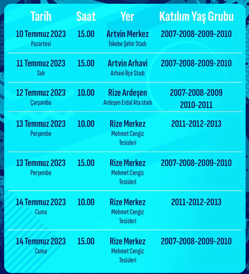 Süper Lig ekiplerinden Çaykur Rizespor'un altyapı sporcu seçmeleri 10-14 Temmuz tarihleri arasında Rize ve Artvin’de gerçekleştirilecek.