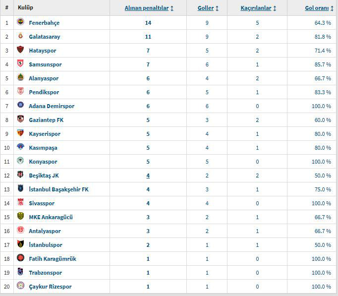Sarı-lacivertli ekibi 11 penaltı ile Galatasaray ve 7'şer penaltıyla da Atakaş Hatayspor ile Yılport Samsunspor takip etti.