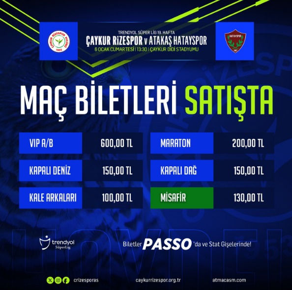 Çaykur Rizespor resmi hesabından Atakaş Hatayspor maçı biletlerinin satışa çıktığını duyurdu.