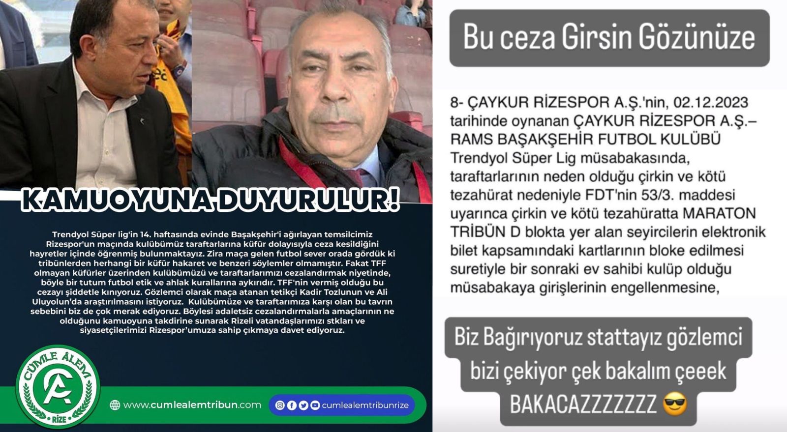 "Çaykur Rizespor A.Ş.'nin, 02.12.2023 tarihinde oynanan Çaykur Rizespor A.Ş.-RAMS Başakşehir Futbol Kulübü Trendyol Süper Lig müsabakasında, taraftarlarının neden olduğu çirkin ve kötü tezahürat nedeniyle fdt’nin 53/3. maddesi uyarınca çirkin ve kötü tezahüratta Maraton Tribün D Blok'ta yer alan seyircilerin elektronik bilet kapsamındaki kartlarının bloke edilmesi suretiyle bir sonraki ev sahibi kulüp olduğu müsabakaya girişlerinin engellenmesine karar verilmiştir"