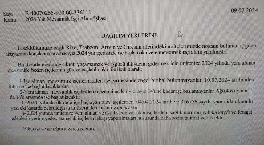 Açıklamada, yapılan görüşme neticesinde 2024 yılı işçi alım kurasında işe girmeye hak kazanan 1100 kişinin 10 Temmuz Çarşamba günü işe alınmasının kesinleştiği kaydedildi.