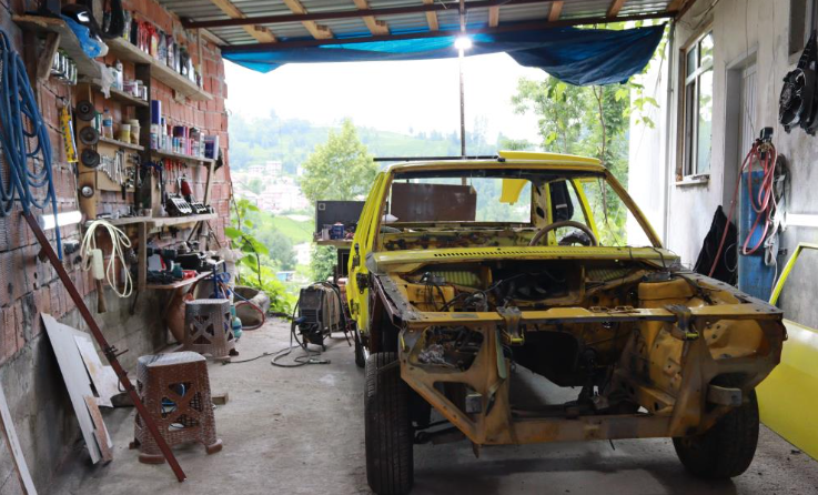 Rize'de yaşayan 17 yaşındaki çocuk, eski model Tofaş araca kendi elleriyle hem zırh hem de motor yapıyor.
