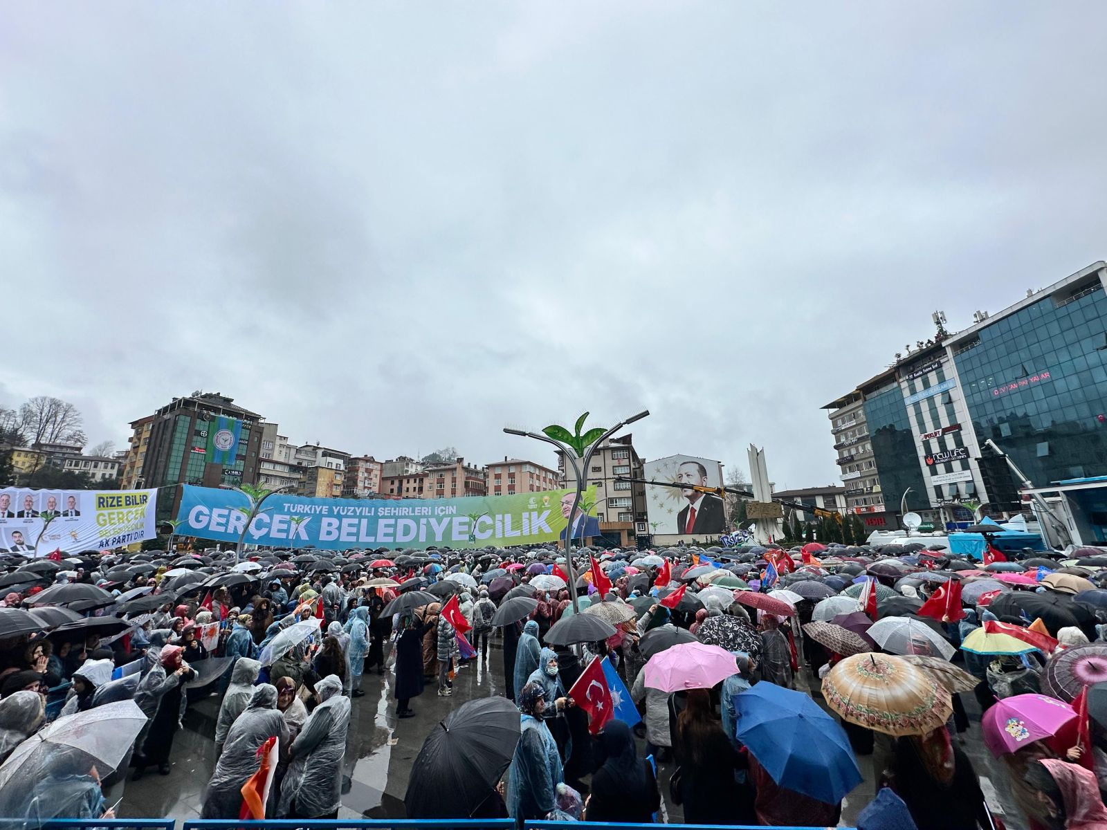 Rize'de yağan yağmura rağmen Cumhurbaşkanı Erdoğan'ı görmek için alana gelen yüzlerce kişi, Erdoğan'a olan sevgilerini ve desteklerini göstermek için bekledi.